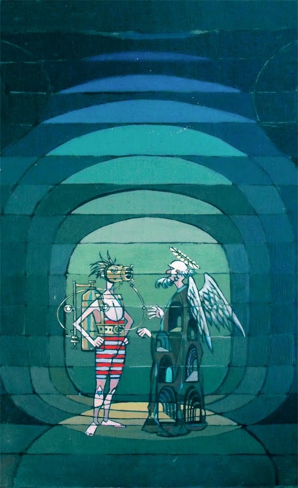 I'm unable to put up any of the work I've done recently. I'm still in negotiation over a book deal and it wouldn't be right to publish the pitch on a blog. So, in the meantime, here's something from the psychedelic depths of the mid-nineties. This is an illustration from the The Dalkey Archive by brilliant Flann O'Brien. This is the bit where mad scientist De Selby meets Saint Augustine in an underwater cave somewhere near Dublin.